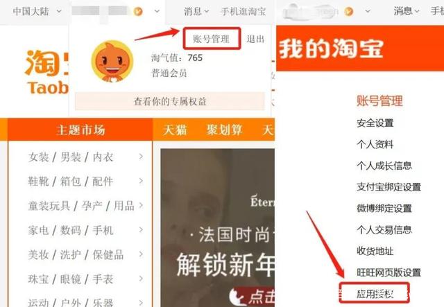 打开网页版淘宝,将鼠标移至头像边,在弹出的选项中点击【账号管理】-【应用授权】中就可以查看。