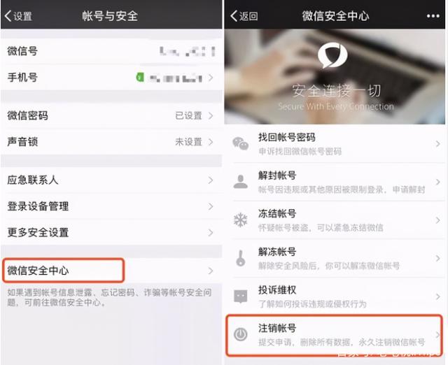 2、点击 “微信安全中心”,然后选择“注销账号”。