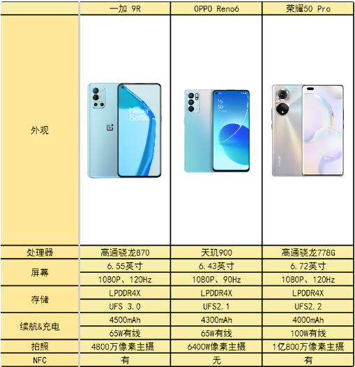 虽然大部分旗舰手机看似差不多,然而使用一段时间后发现实际上却也有很大差别。就像今天的这几款,从市场热销就能看出它们非同一般,它们分别是一加 9R、OPPO Reno6、荣耀50 Pro,首先来看主要参数表。