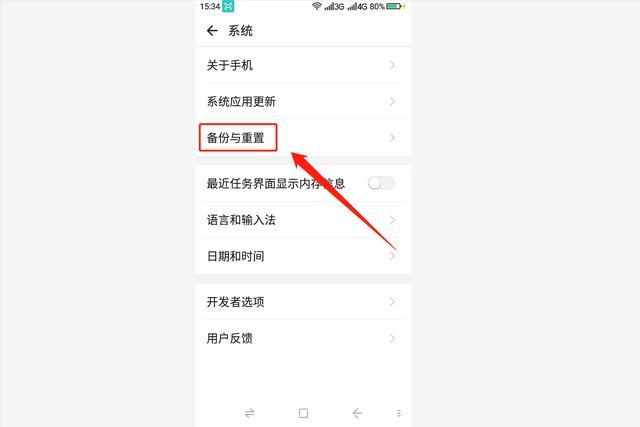 点击系统选项,下拉菜单,找到“备份与重置”选项。如下图: